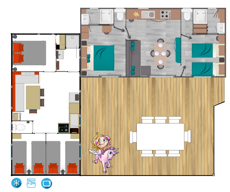 Por lo tanto, le hemos construido un alojamiento a su gusto. Un gran mobil-home, espacioso, con mucha claridad y con las mejores prestaciones para un buen descanso.