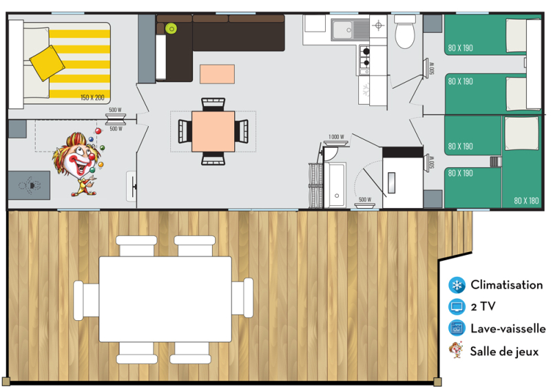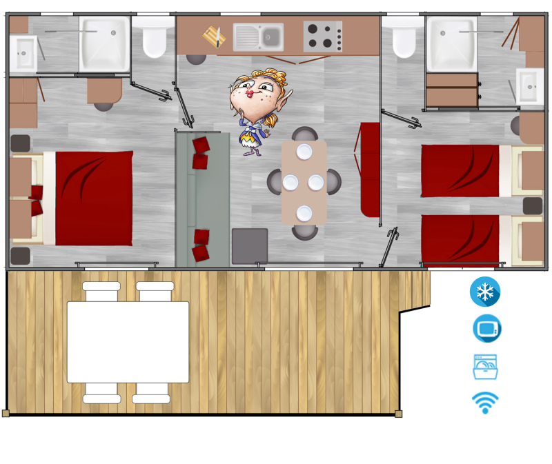 Por lo tanto, le hemos construido un alojamiento a su gusto. Un gran mobil-home, espacioso, con mucha claridad y con las mejores prestaciones para un buen descanso.