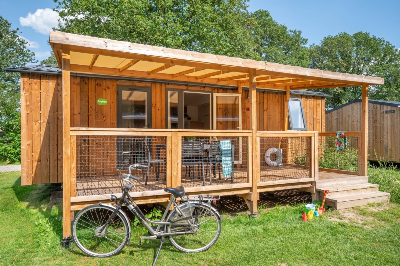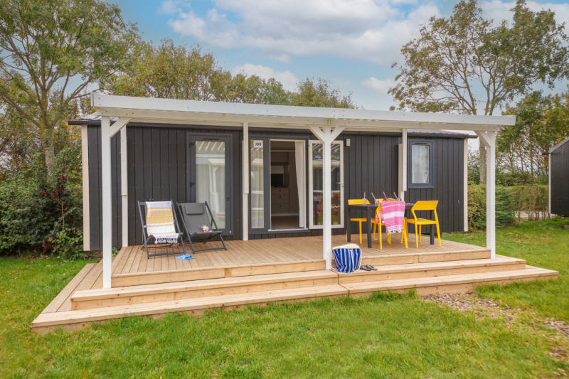 Le mobil-home Jasmijn Top TV 4 est équipé d'une terrasse couverte en bois surélevée ou d'une terrasse en pierre au sol avec une pergola en aluminium. La pergola est dotée de panneaux coulissants permettant de s'installer au soleil ou à l'ombre selon vos envies.