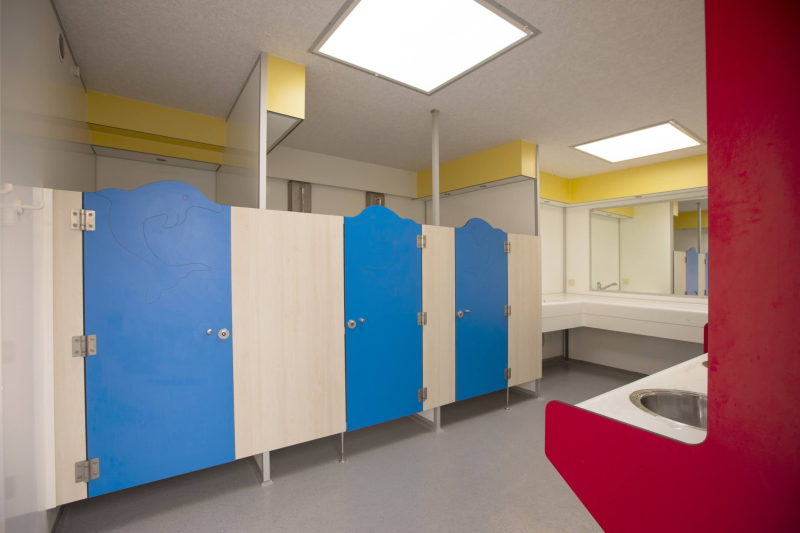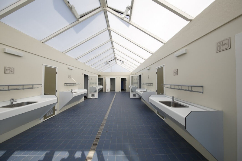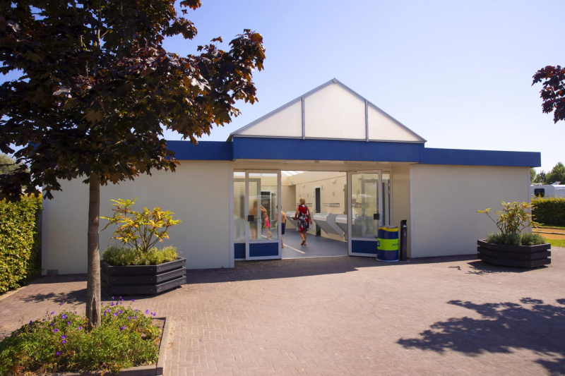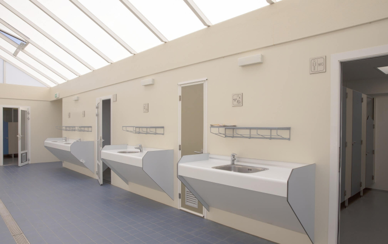 En el centro del campo de acampada se encuentra el edificio de aseos, que cuenta, entre otras cosas, con aseos para niños, duchas familiares y aseos adaptados para personas con discapacidad.