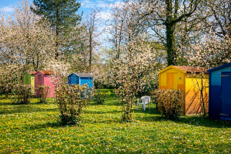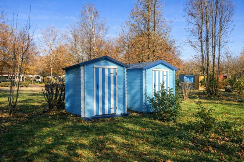 Le 'must' du campeur, c'est un emplacement comprenant un bâtiment sanitaire privatif, avec douche, toilette et lavabo et un équipement complet: un abri de jardin contenant un salon de jardin, une plancha, deux transats et un réfrigérateur.