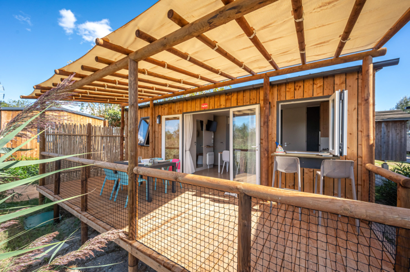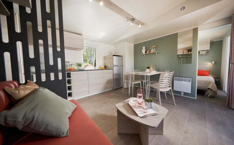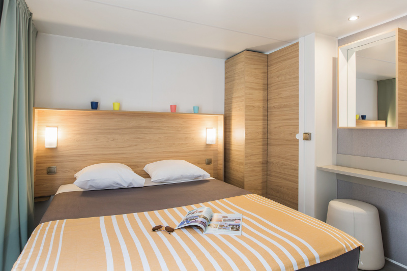 Por lo tanto, le hemos construido un alojamiento a su gusto. Un gran mobil-home, espacioso, con mucha claridad y con las mejores prestaciones para un buen descanso.