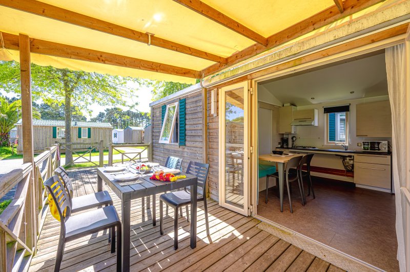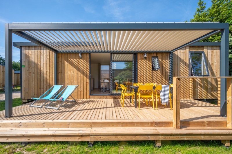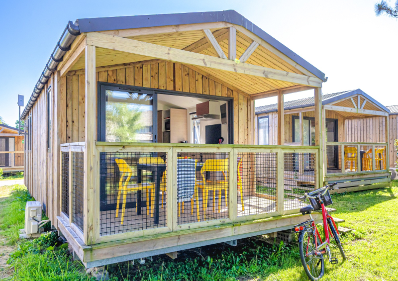 2 Mobil-Homes comparten una terraza grande y un tercer Mobil-Home mantiene su independencia.