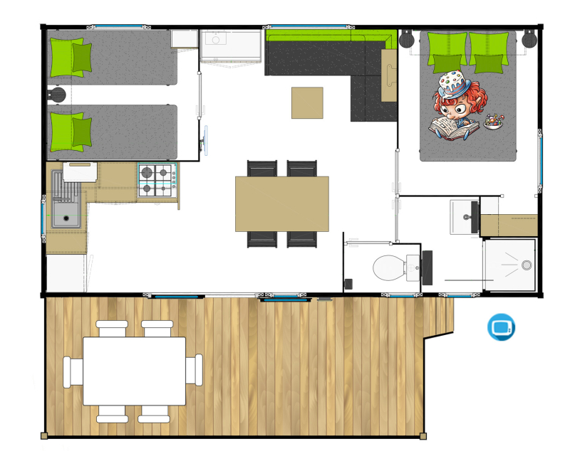 Por lo tanto, le hemos construido un alojamiento a su gusto. Un gran mobil-home, espacioso, con mucha claridad y con las mejores prestaciones para un buen descanso.