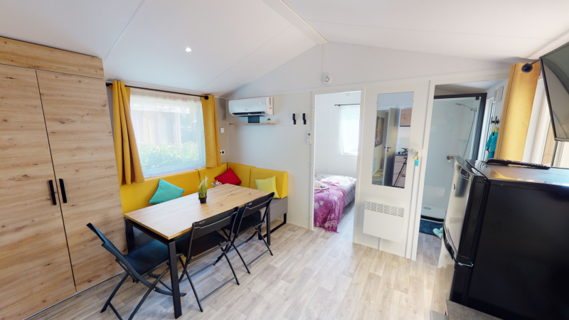 Por lo tanto, le hemos construido un alojamiento a su gusto. Un gran mobil-home, espacioso, con mucha claridad y con las mejores prestaciones para un buen descanso.
