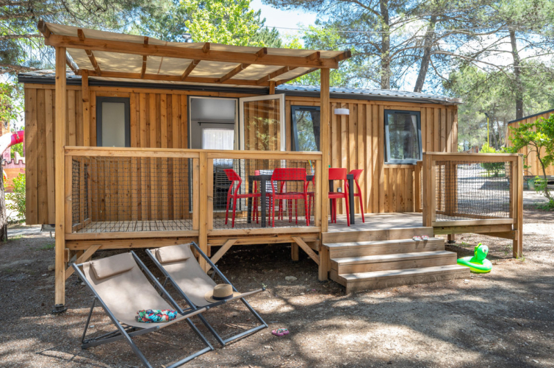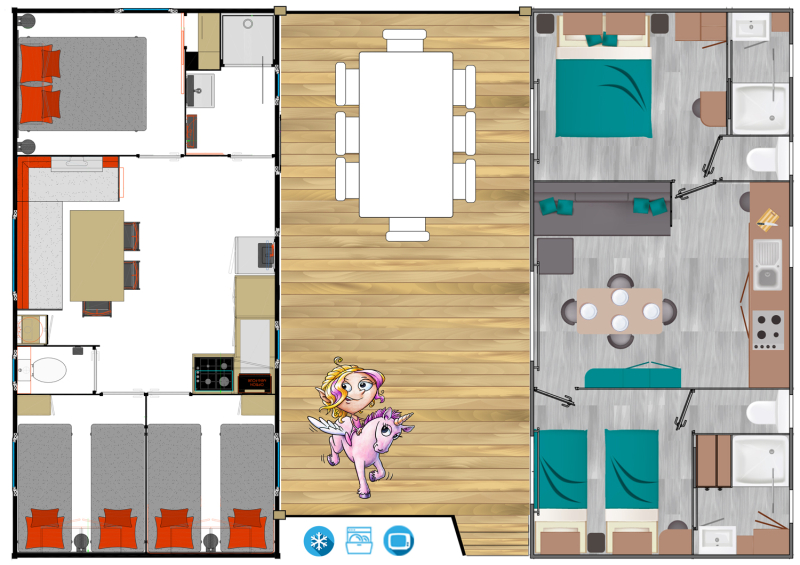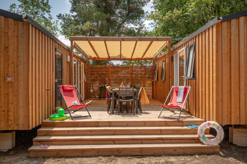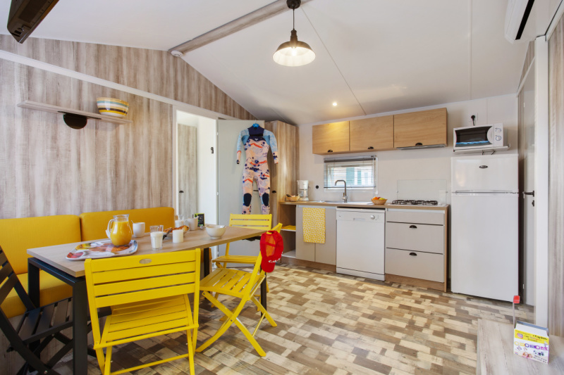 Por lo tanto, le hemos construido un alojamiento a su gusto. Un gran mobil-home, espacioso, con mucha claridad y con las mejores prestaciones para un buen descanso.