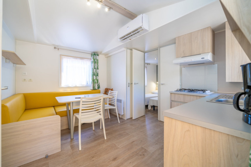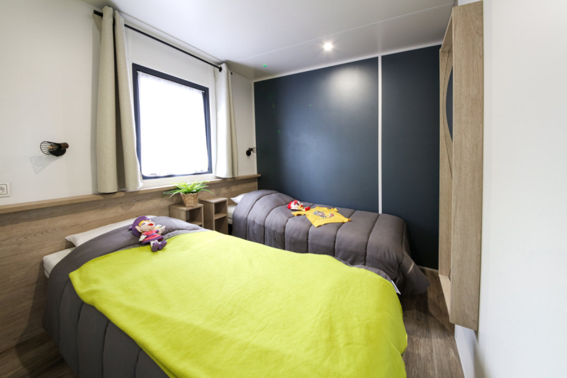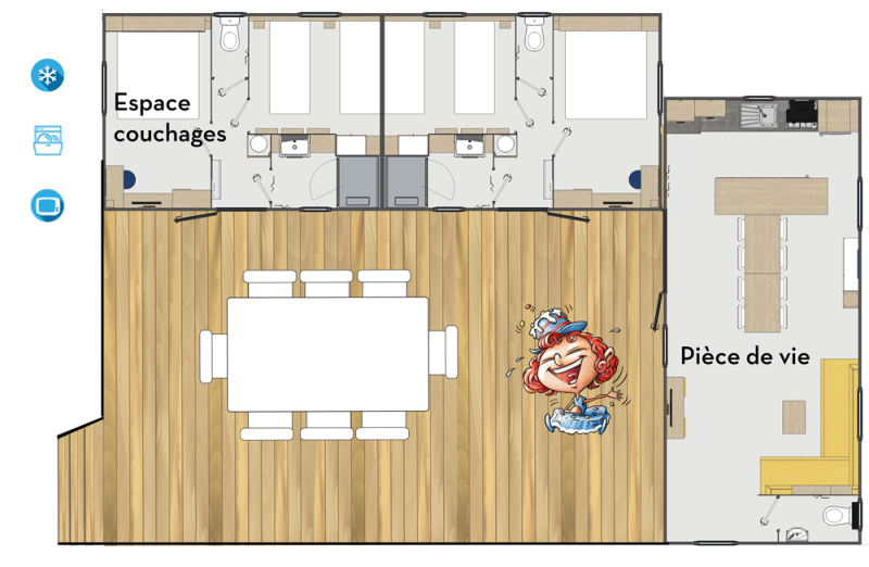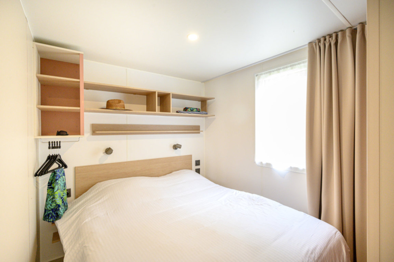 Por lo tanto, le hemos construido un alojamiento a su gusto. Un gran mobil-home, espacioso, con mucha claridad y con las mejores prestaciones para un buen descanso.