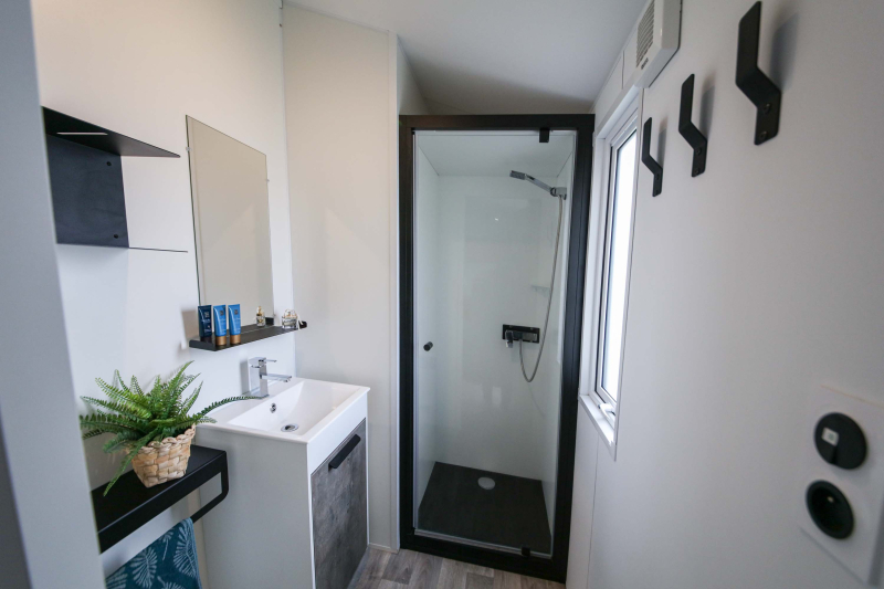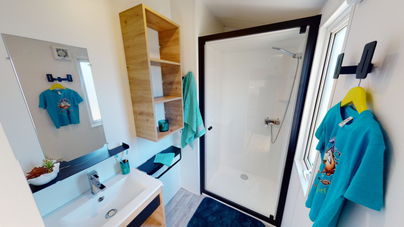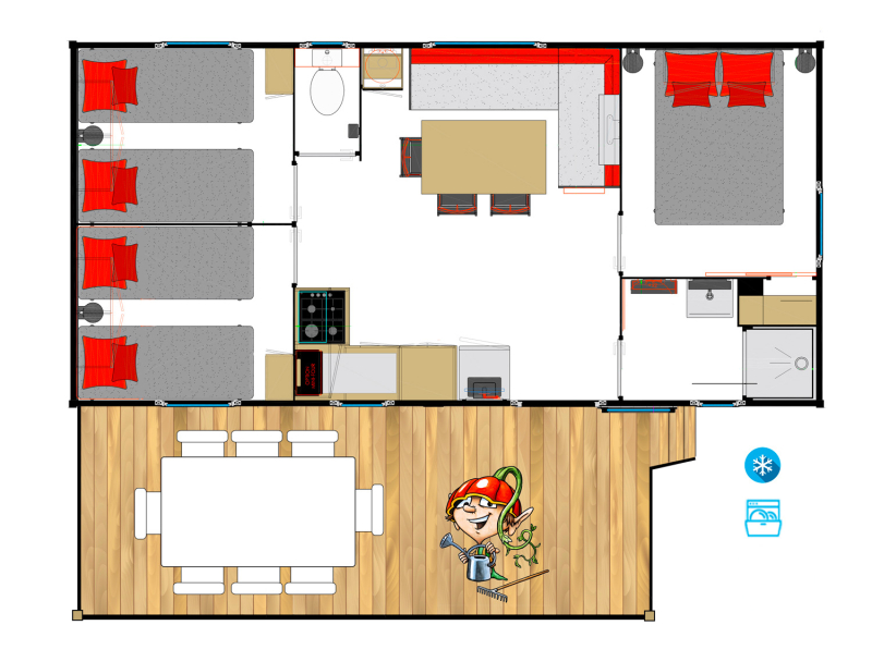 Por lo tanto, le hemos construido un alojamiento a su gusto. Un gran mobil-home, espacioso, con mucha claridad y con las mejores prestaciones para un buen descanso.
